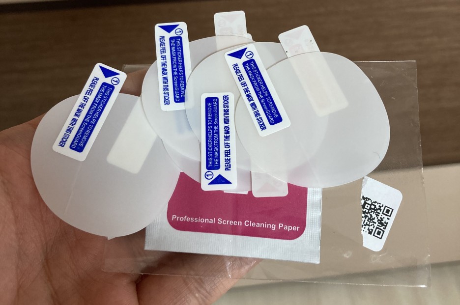 렌즈 보호 필름: 구매하면 일반 알리 배송으로 와서 그런지 정말 느리다. 40-50일 걸린다고 보면 되고, 1쌍에 2개씩 들었는데, 우레탄 필름인지 살짝 늘어나는 재질이다. 렌즈가 구면이어서 붙일 때 약간 힘들고 공기 방울이 들어가는 경우가 있다. 몇 번의 연습이 필요해서 1쌍만 주문하면 낭패를 볼 수 있으니, 꼭 2세트 이상 구입하도록 하자.