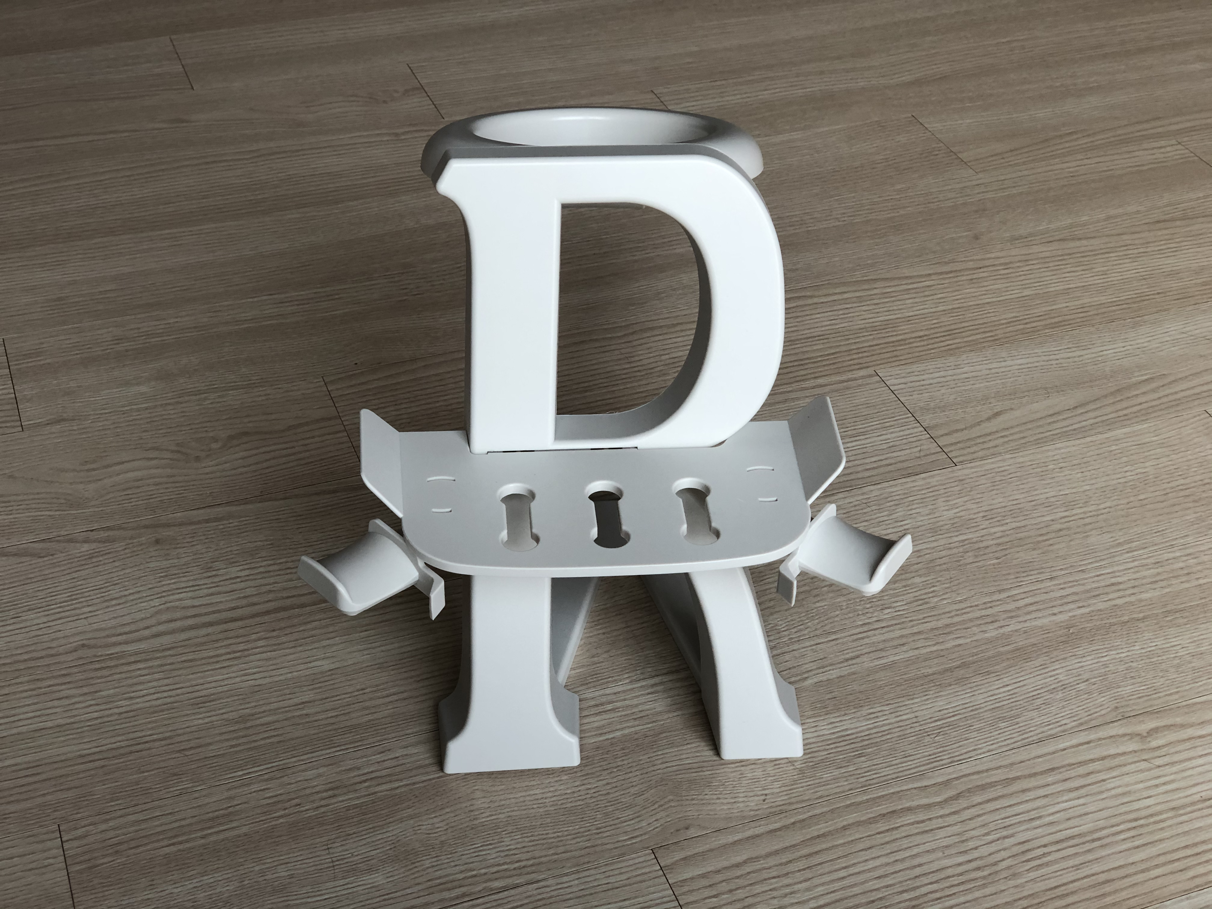 다 조립을 하고 오큘러스 퀘스트 2를 거치하니 딱 맞아떨어지네요. 받침대의 V가 뒤로 길게 있어서 배터리 작업을 해줘서 뒤에 무게가 실리는데도 안정적이게 거치를 해주네요.