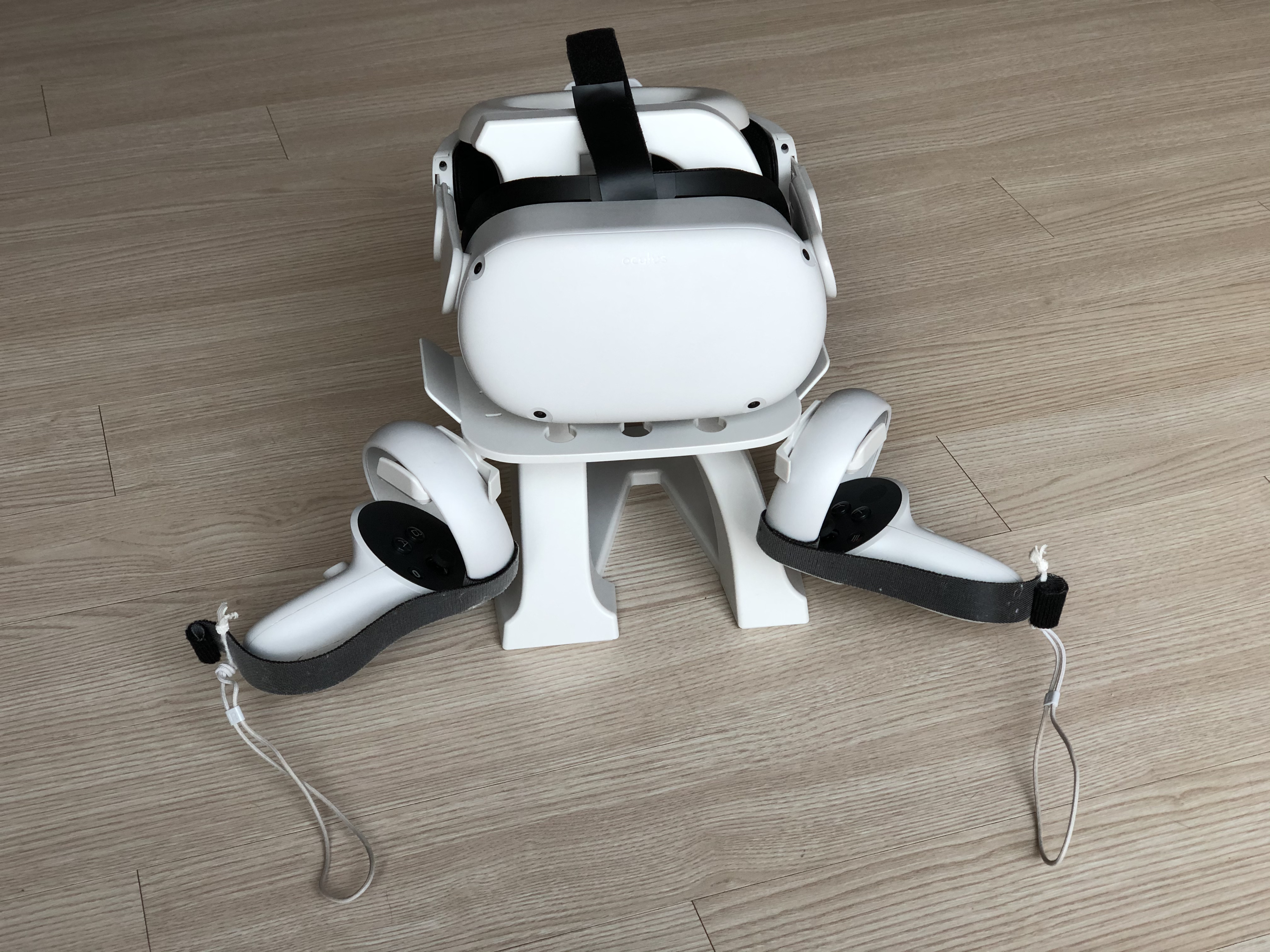 다 조립을 하고 오큘러스 퀘스트 2를 거치하니 딱 맞아떨어지네요. 받침대의 V가 뒤로 길게 있어서 배터리 작업을 해줘서 뒤에 무게가 실리는데도 안정적이게 거치를 해주네요.
