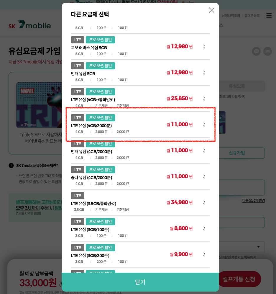 그리고 요금제는 다른 요금제를 선택하고, 전체를 눌러서 LTE유심(4GB/2000분)를 선택하세요.