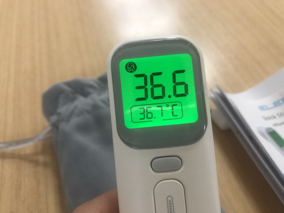 그리고 뚜껑을 벗기고 귀 모드로 측정하니 이마로 측정했을 때와 동일한 값이 나옵니다. 그리고 집 모드로 측정하니 테이블 등 일반적인 물건 온도도 측정이 가능합니다.