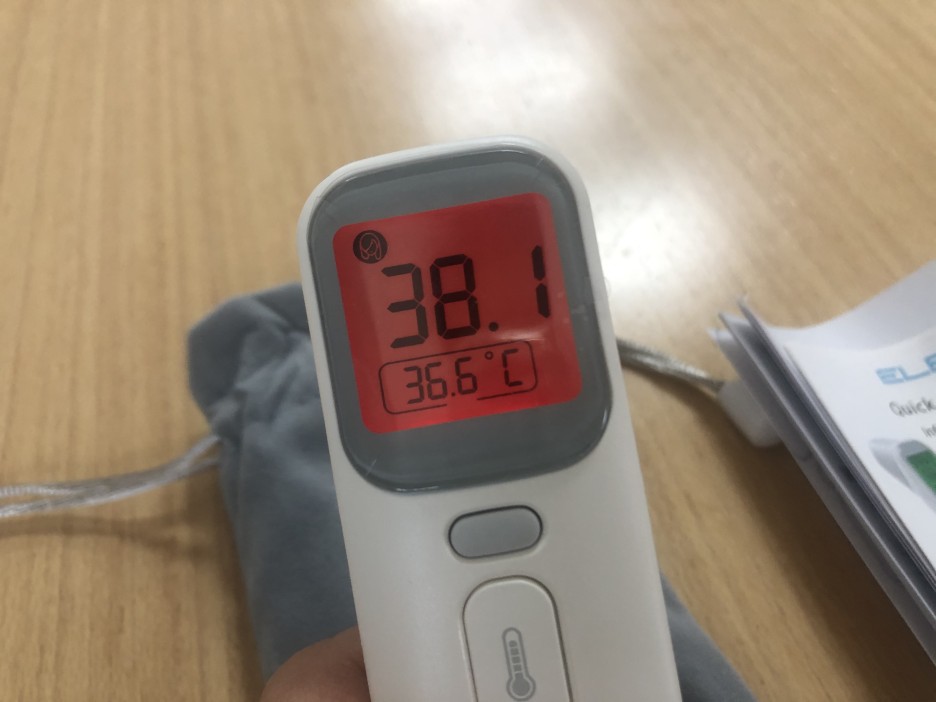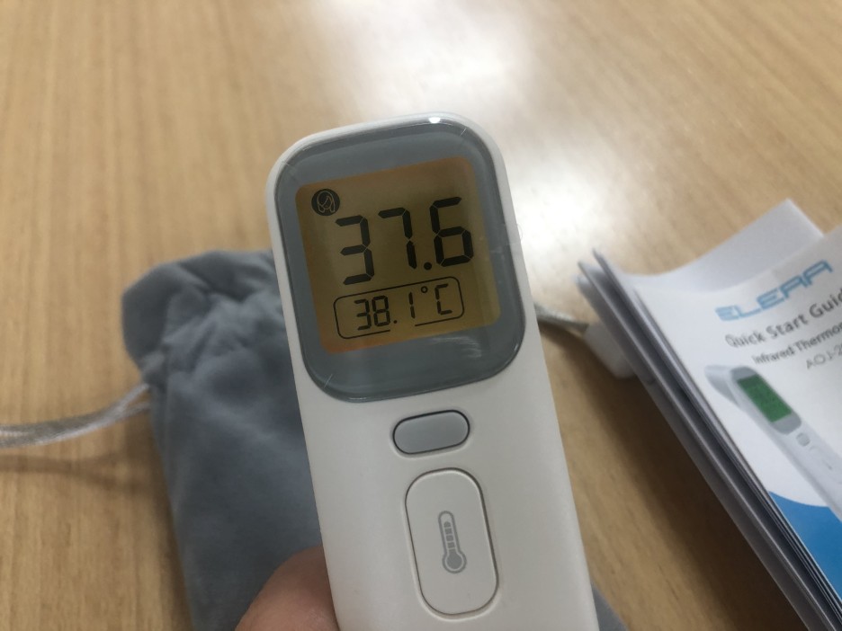 온도 측정은 온도계 아이콘의 버튼을 누르는 순간 삐- 소리가 나며 측정됩니다. 온도가 39도 이상으로 높으면 화면은 빨간색으로 바뀌며, 삐비비빅삐빅 이런 다른 소리를 냅니다.