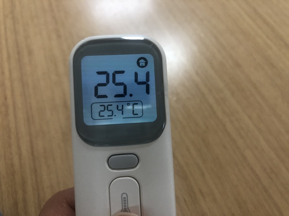 그리고 뚜껑을 벗기고 귀 모드로 측정하니 이마로 측정했을 때와 동일한 값이 나옵니다. 그리고 집 모드로 측정하니 테이블 등 일반적인 물건 온도도 측정이 가능합니다.