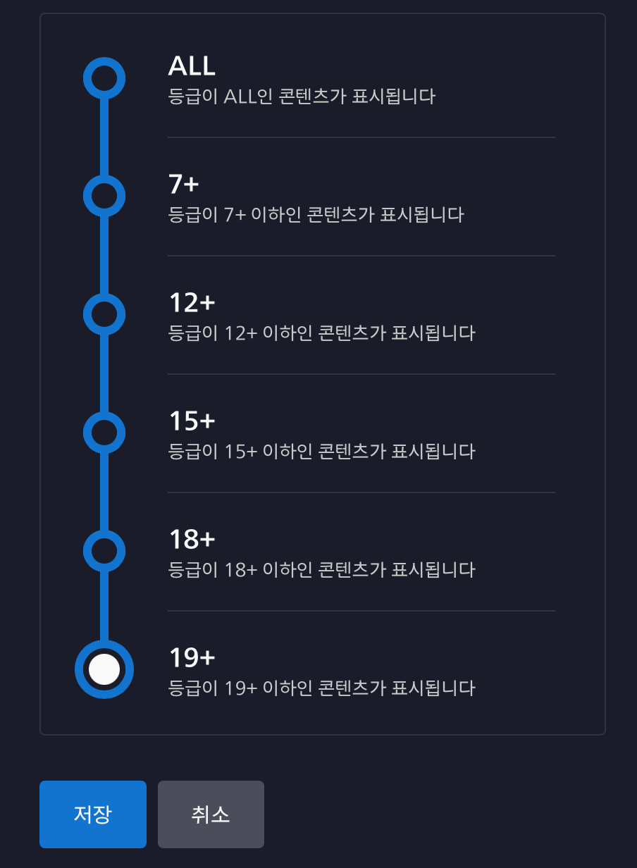 이제 재접속을 하니 정상적으로 19세까지 콘텐츠 등급을 설정할 수 있게 되었다.