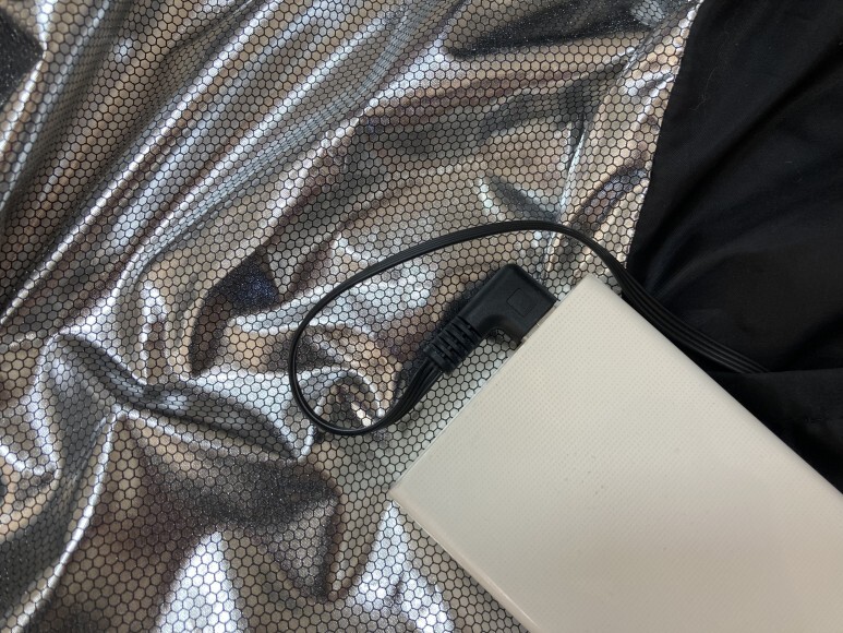 안감은 겨울 패딩처럼 온도를 지켜주는 천으로 마감되어 있습니다. 그리고 안주머니에 보조배터리 연결선이 있습니다. 여기에 보조배터리를 넣고 연결하면 됩니다.