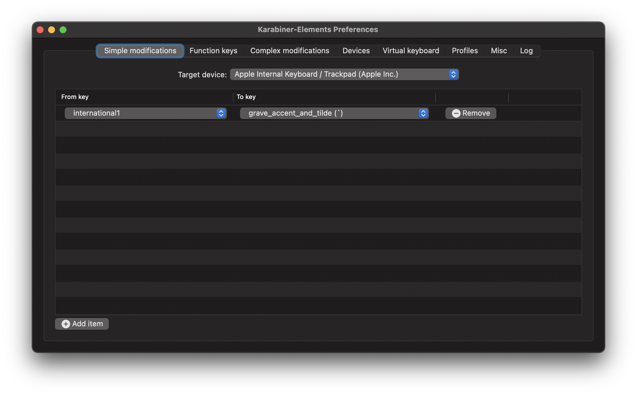 그림과 같이 From key에서 international1을 선택을 하고 To key에서 grave_accent_and_tilde(`)를 선택하면 됩니다.