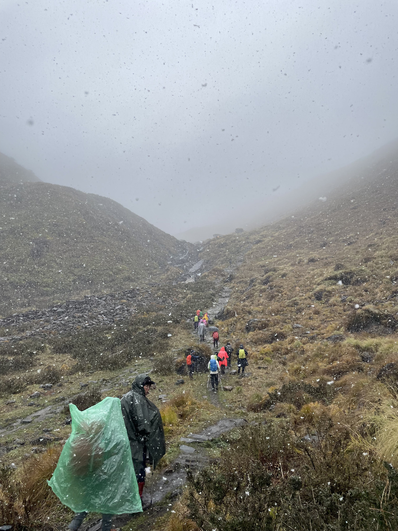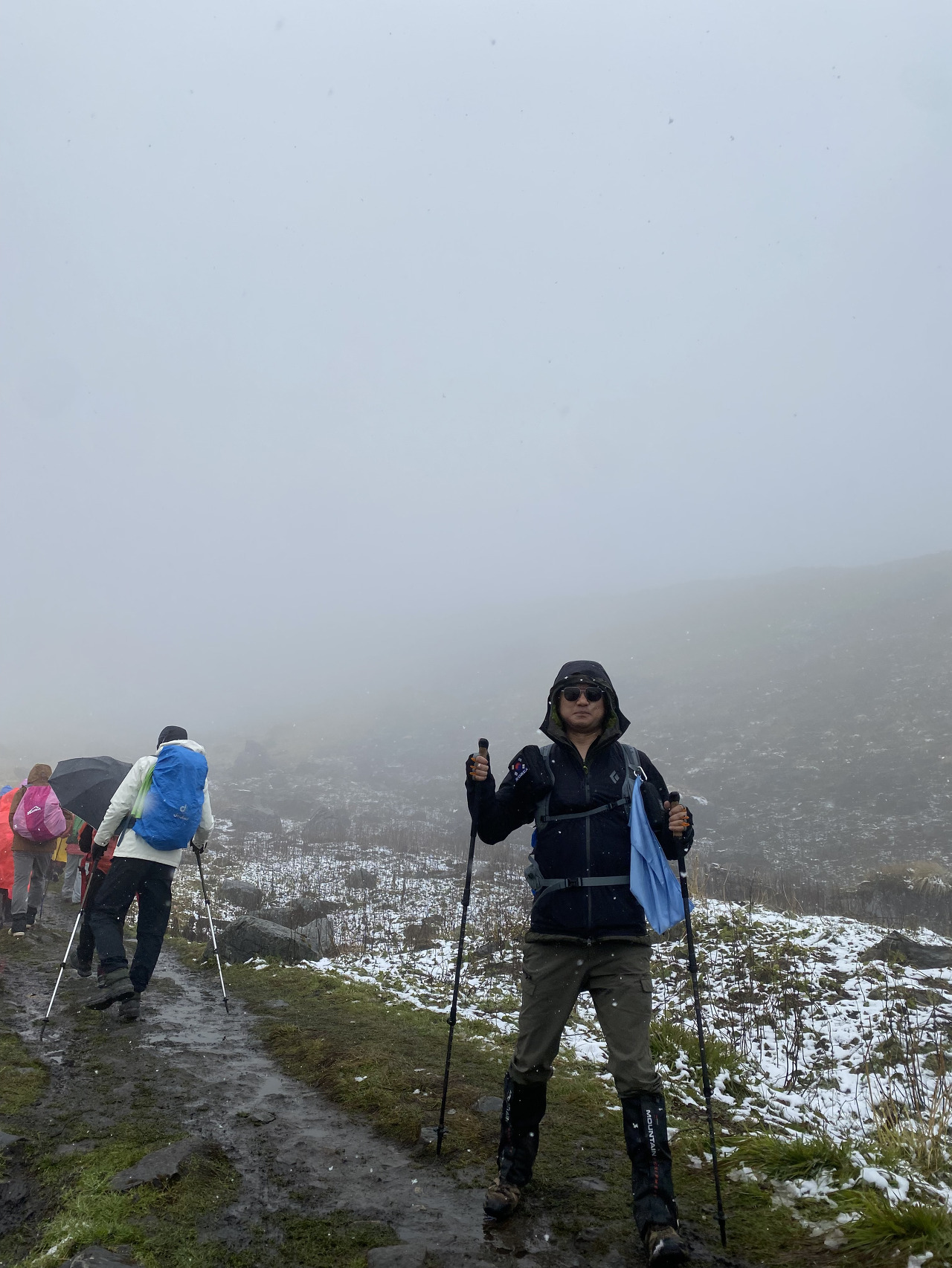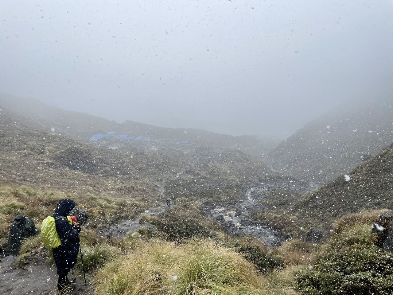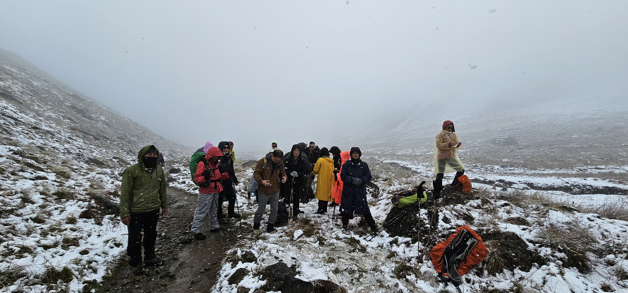 MBC에서 점심으로 한국식 오뚜기! 카레밥이 나왔다. 맛있게 먹고 나오니 갑자기 롯지 주변이 구름으로 덮였고, 비가 내리더니 금세 눈으로 바뀌었다. 우리 일행은 눈&보온 대비를 위해 우의를 입고 옷을 단단히 껴입고 마지막 목적지로 이동했다. 이제 400m 정도만 오르기만 하면 된다…