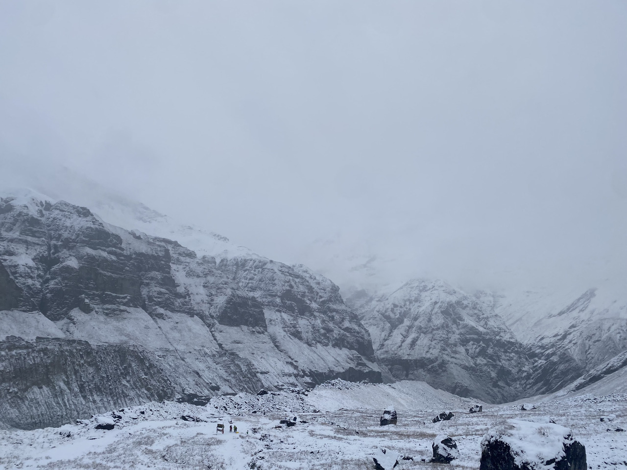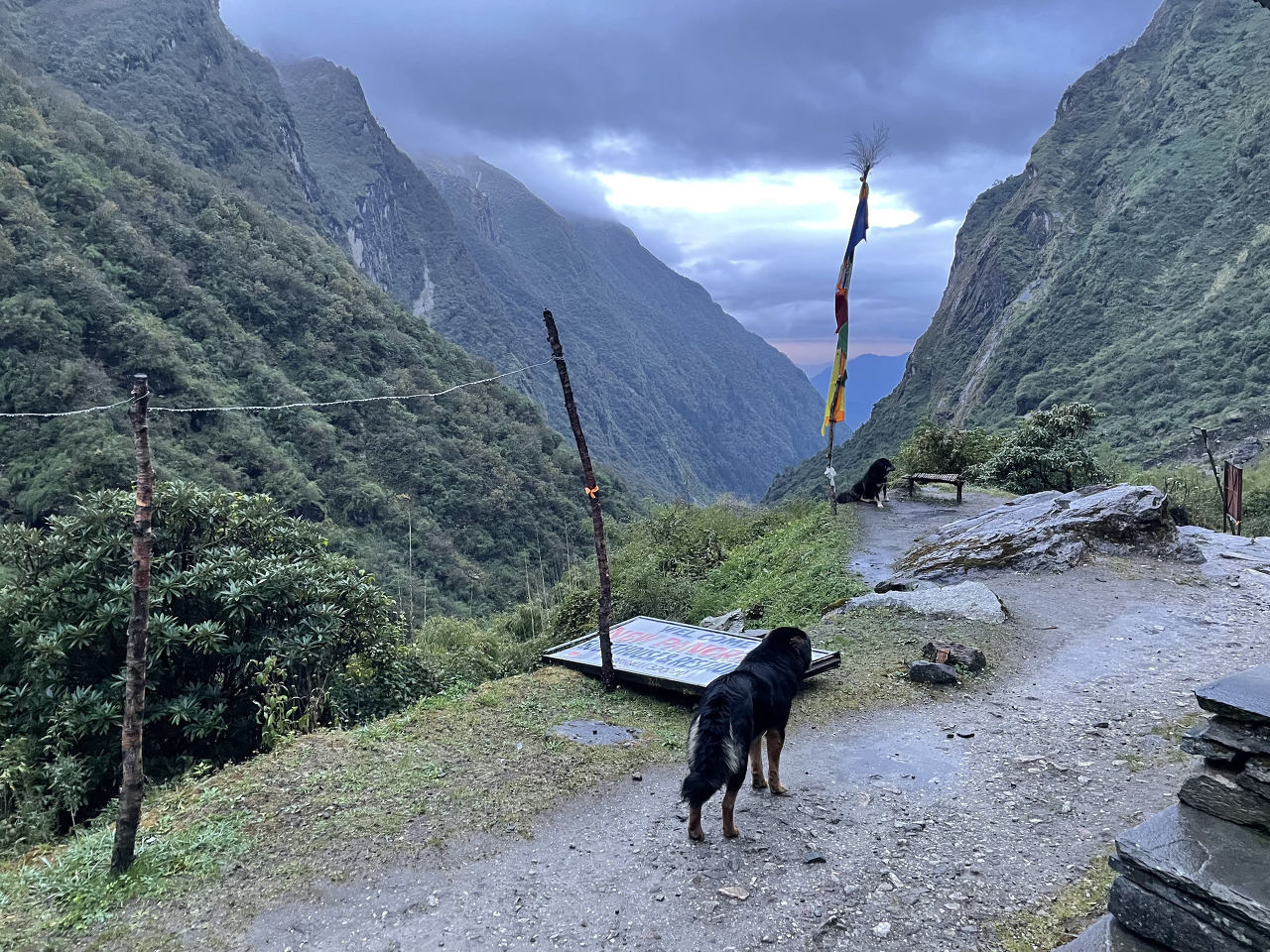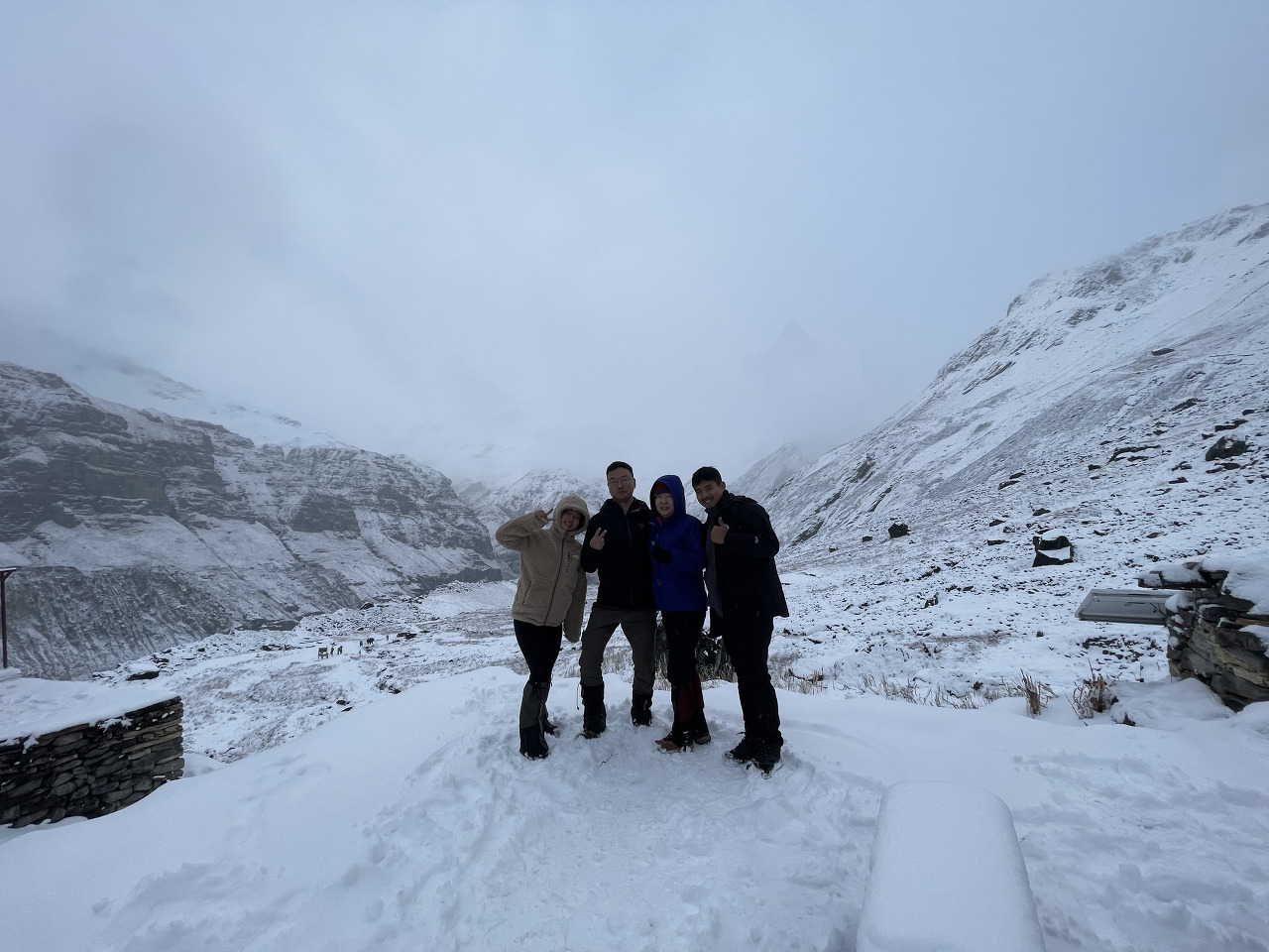 가면서 눈은 멈출 기세는 안 보이고 점점 심하게 함박눈으로 바뀌었다. 그래도 비가 아닌 게 어딘가. 눈에 가려져 안나푸르나 봉우리를 못 보고 걷는 게 아쉽긴 했어도 또 다른 경험을 맞이할 수 있어 좋았다.