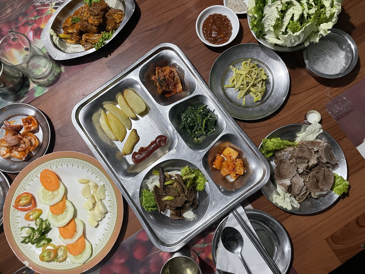 짐을 내려놓으니 쿠키와 밀크티를 주셨다. 각자 방으로 들어가서 짐을 정리를 하고 첫날 저녁식사로 돼지 수육을 먹었다. 일행 중 한 분이 맥주 한 캔씩을 쏘셨고 일행 중 한 분이 가져온 소주와 내가 가져온 소주(3일간 홀짝 먹으려 가져왔지만 하루 만에 다 먹었네…)도 꺼내서 소맥을 말아서 잘 먹었다. 아직까지는 술을 조금해도 3000m 이상의 고산이 아니기에 괜찮다.