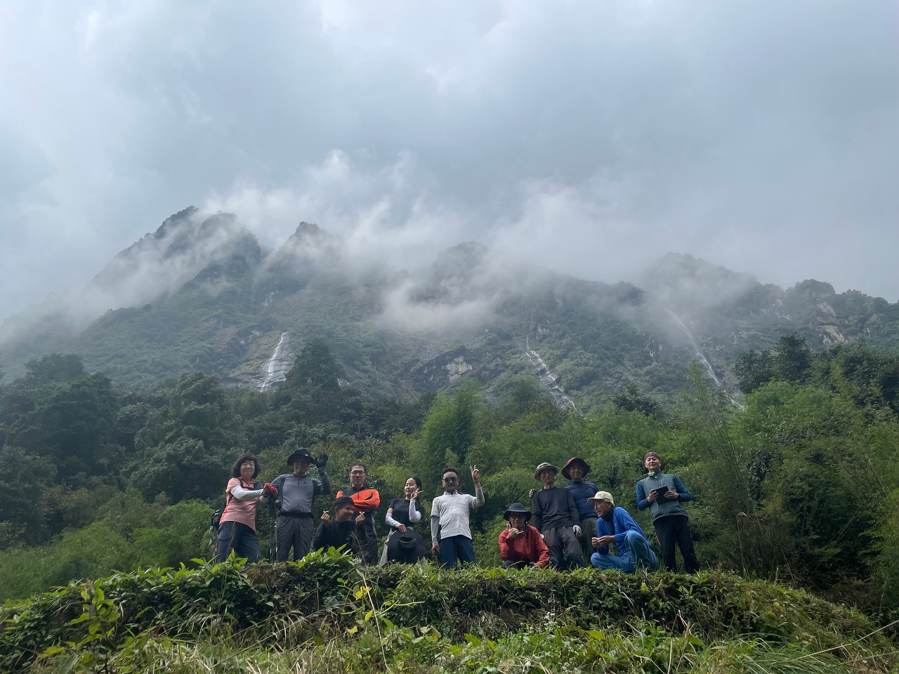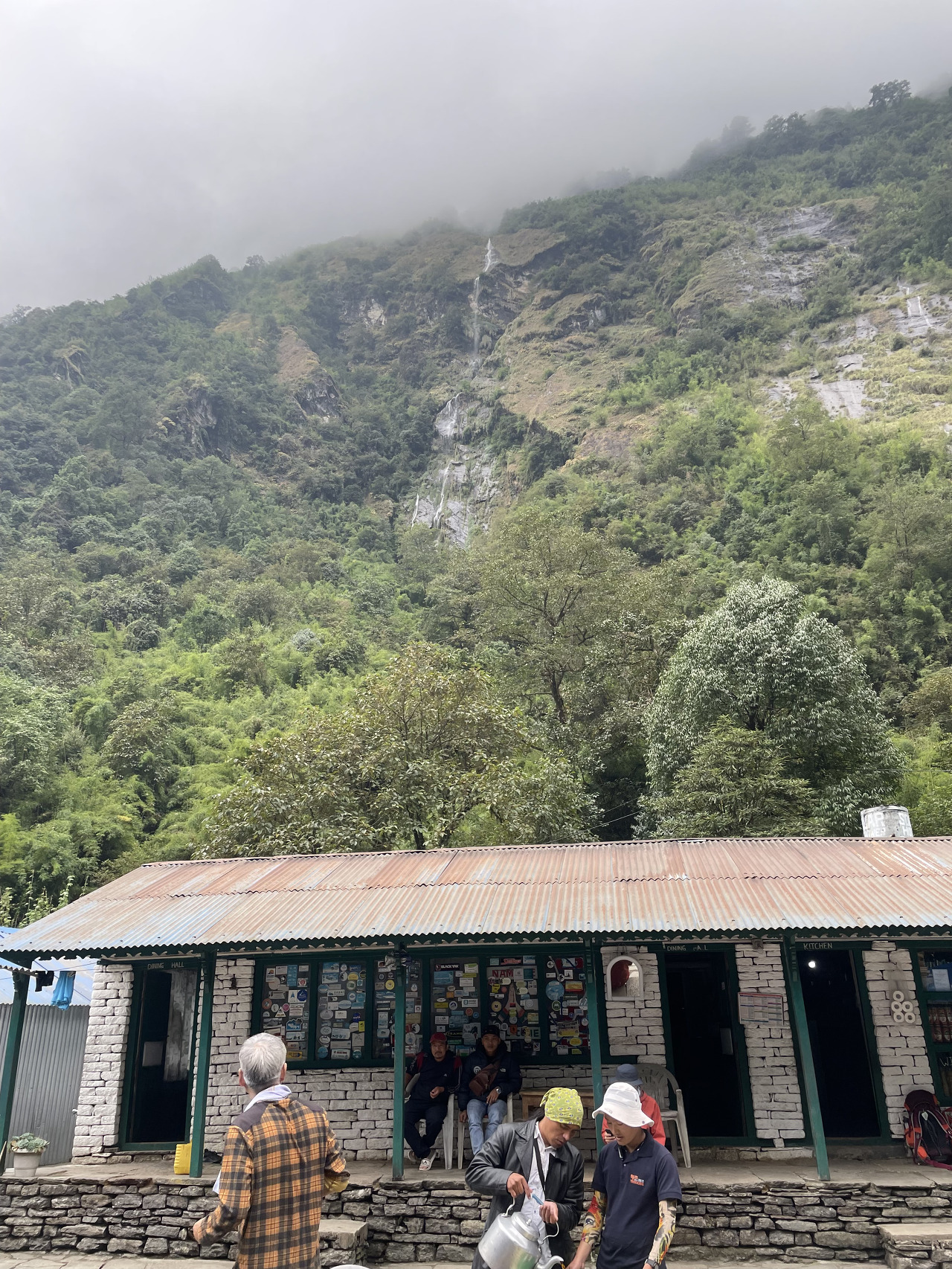 1시간 45분을 걸어서 밤부에 도착을 했다. 배경으로 정말 멋진 폭포들이 보인다. 이 폭포에는 선녀가 내려와서 어쩌고 저쩌고... 전설이 있다고 한다.... 믿거나 말거나. 그리고 점심으로는 수제비를 먹었다. 산행 중 음식이 다 맛있겠지만 정말 맛있다. 그리고 우리가 남긴 잔반은 개들이 맛있게 냠냠한다. 그래서 개들은 사람을 헤치지 않고 졸졸 따라오기만 한다.