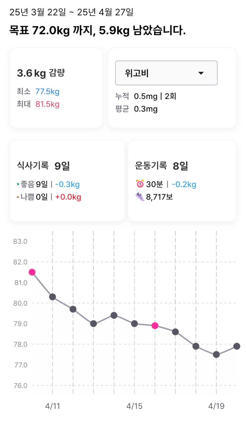 위고비를 시작하기 전, BMI는 25~26 정도로 과체중 상태였습니다. 최근 몇 년간 앞자리가 바뀔 정도로 살이 쪄 허리가 많이 아팠습니다.