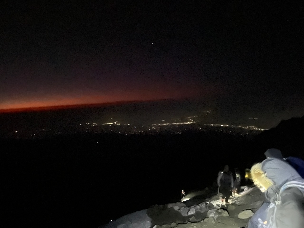 휴식시간에 콜라를 마시기 위해 뚜껑을 땄더니 슬러시가 되어 있었고, 땀에 젖은 장갑은 얼어가고 있어서 더 추웠다. 빨리 올라가고 싶지만, 위험하기에 다들 천천히 폴레폴레 걷는다. 걷다 보니 저 아래 도시 불빛도 보인다.