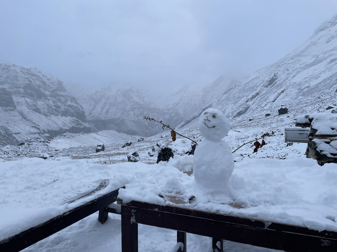 가면서 눈은 멈출 기세는 안 보이고 점점 심하게 함박눈으로 바뀌었다. 그래도 비가 아닌 게 어딘가. 눈에 가려져 안나푸르나 봉우리를 못 보고 걷는 게 아쉽긴 했어도 또 다른 경험을 맞이할 수 있어 좋았다.